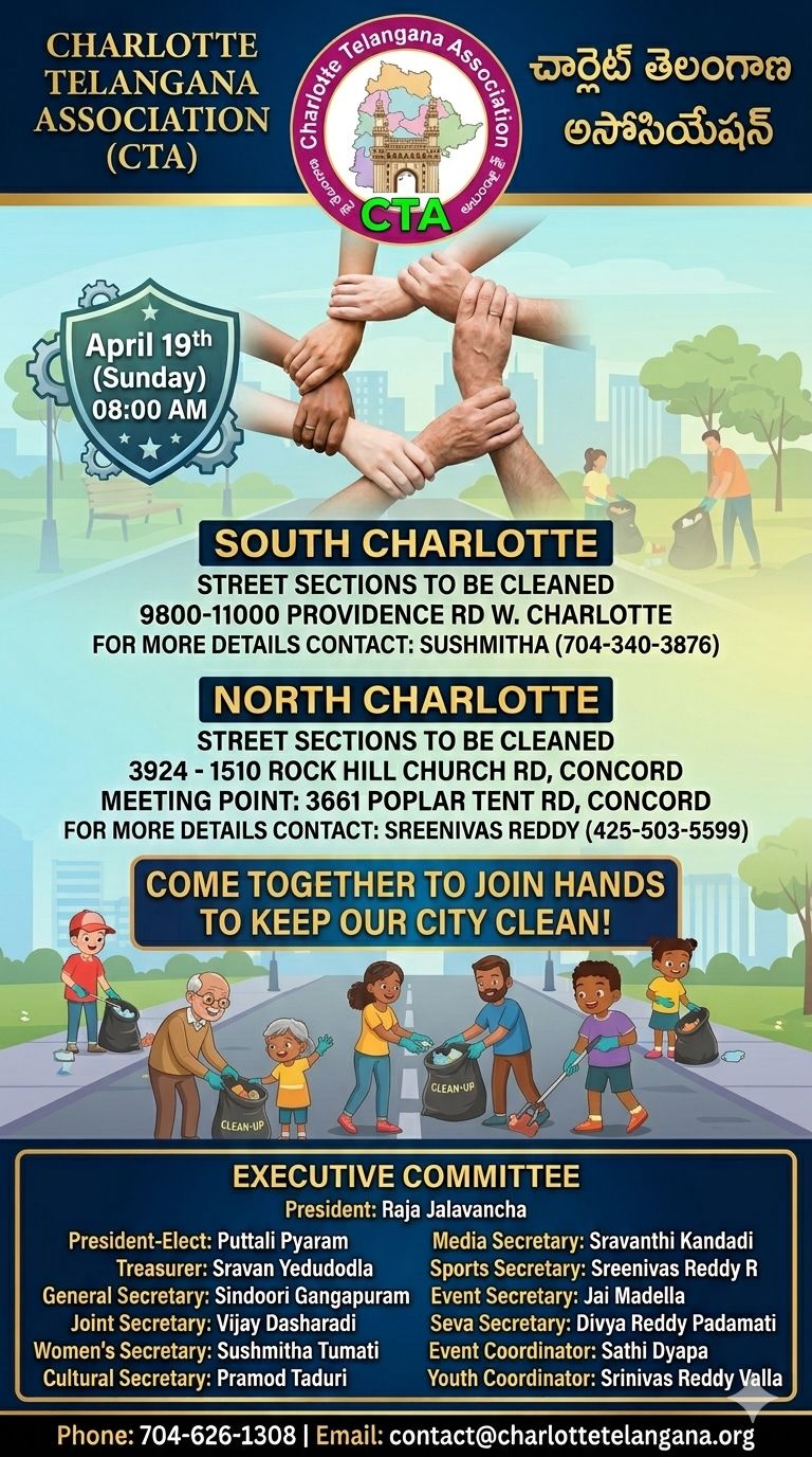 “Charlotte Telangana Association” is a non-profit organization formed to promote two different aspects. On one hand to promote not only the telangana cultural activties within greater Charlotte area, but also to bring together all the telangana people living in greater Charlotte area.